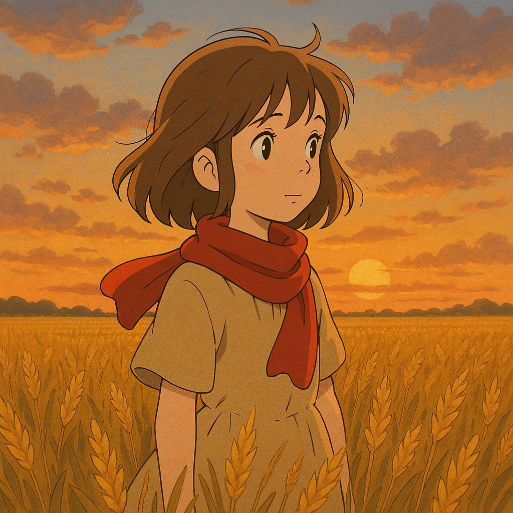- A young girl with a red scarf standing in a wheat field, sunset in the background, in Ghibli style